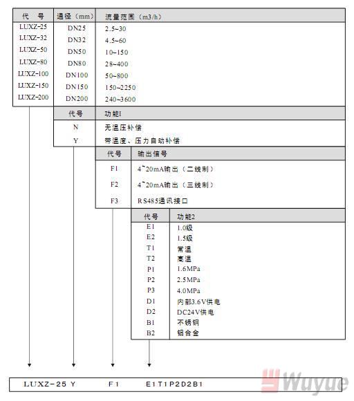 选型:从以上计算结果得知,要选择的流量计其工况流量范围为214~1200m3/h;由说明书表1查得,